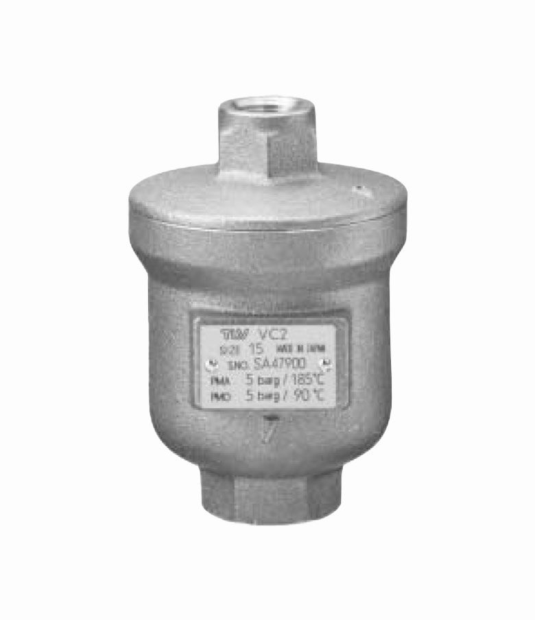 Stainless steel air vent for vertical installation in liquid systems. Automatically vents air from liquids above 0.8 S.G.